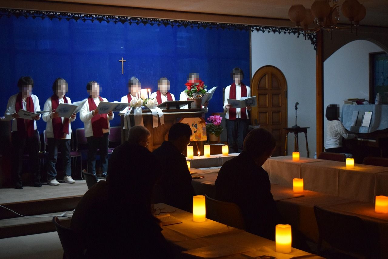 蝋燭の灯りのもと、イエス・キリストの生誕のお話しや讃美歌に耳を傾けクリスマスを祝いました。