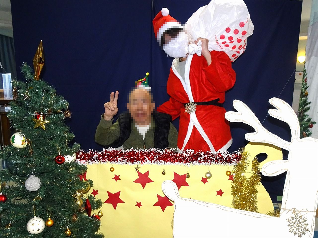 12月12日(金)にクリスマス会を行いました。手作りのソリを天井からぶら下げてご利用者の方がサンタと乗っているかのような感じで写真を撮りました。その後、神原牧師よりクリスマスのお話をして頂き全員で歌を2曲歌いました。最後に、ケーキとコーヒーでティタイムをして楽しんで頂きました。皆さんから「美味しかったわ」と感想を頂きました。廊下や壁にはクリスマスの飾りがたくさんあり、音楽も流れクリスマスの雰囲気を存分に味わって頂けたと思います。クリスマス会の様子をいっぱい写真に撮りました。その写真をかわいく飾り付けをして廊下に貼っています。面会に来られたご家族から「楽しそうなクリスマス会をして下さってありがとうございます。」と嬉しい言葉を頂きました。また機会があれば見に来てください。
