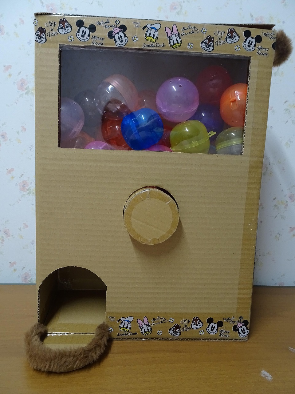段ボールで作ったガチャガチャを食堂に置き、ご利用者に回して頂きました。カプセルが出てきた時にはびっくりされている方もいました。何人かの方にガチャガチャをしたことがあるか尋ねたところ「初めてや!」と言われる方ばかりでした。感想をお聞きすると、「楽しかった!」「またやりたい!」「誰が考えたの?」と喜ばれ楽しんで頂く事が出来ました。景品を選ぶ時には真っ先にお菓子を選ばれる方や悩みに悩んで写真立てを選ばれる方もいました。ご自分で好きな景品を選んで頂けて良かったと思います。